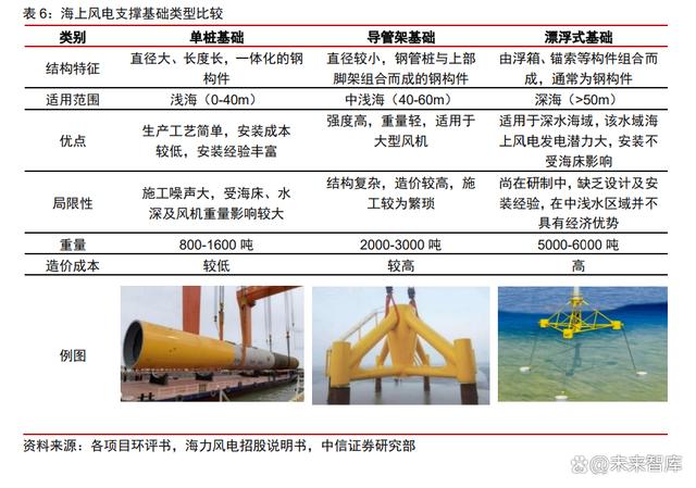 塔筒、樁基是風(fēng)電設(shè)備中的支撐基礎(chǔ)部件,分別用于連接和承載風(fēng)電機(jī)組、支撐和固 定整機(jī)。風(fēng)電塔筒除塔體外,其內(nèi)部通常有爬梯、電纜梯、平臺(tái)等內(nèi)部結(jié)構(gòu),以供風(fēng)電機(jī) 組的運(yùn)營(yíng)及維護(hù)使用。風(fēng)電支撐基礎(chǔ)分為單樁、導(dǎo)管架和漂浮式基礎(chǔ)三類(lèi),淺海區(qū)域中機(jī) 組安裝在下端深入海床地基的樁基或?qū)Ч芗苌希珊4驳鼗峁┲?深海區(qū)域中樁基、 導(dǎo)管架有長(zhǎng)度限制,無(wú)法實(shí)現(xiàn)支撐功能,漂浮式基礎(chǔ)主要由浮箱及錨繩組成,浮箱為海上 風(fēng)電機(jī)組提供支撐力,并通過(guò)錨索或纜繩將塔筒與海底相連,使機(jī)組可以在某一相對(duì)固定 的區(qū)域內(nèi)自由移動(dòng)。