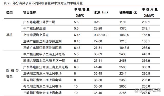 風(fēng)電大型化和深海化推動樁基、塔筒單機用量增長。據(jù)海力風(fēng)電招股書,適用于 0- 24m 水深單機容量 4MW 的單樁基礎(chǔ)重量在每臺 550-1000 噸之間;水深 30m 以上單機 容量 5MW 使用的四樁導(dǎo)管架基礎(chǔ)重量為 243 噸。以三峽陽江沙扒三期和三峽陽江青洲六 項目對比測算樁基塔筒單機用量,陽江沙扒三期安裝單機容量 6.45MW 風(fēng)機 62 臺,陽江 青洲六分別安裝 8MW 和 10MW 容量風(fēng)機 25 和 80 臺,風(fēng)機葉片直徑、輪轂高度數(shù)值均增 大,單臺塔筒和樁基用量為 734 噸和 2657 噸,較淺水域小容量風(fēng)機項目對應(yīng)的 380 噸和 1693 噸用量提升。