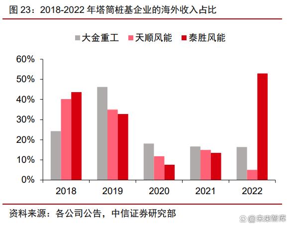 頭部廠商重視外銷業(yè)務(wù),有望持續(xù)拓展全球市場(chǎng)份額。國(guó)內(nèi)頭部企業(yè)均積極延伸海外 業(yè)務(wù),在建產(chǎn)能規(guī)劃于2023-2024 年陸續(xù)投產(chǎn)。代表性廠商在 2018-2019 年海外收入占 比平均超 30%,2020 年和 2021 年受益陸上和海上風(fēng)電搶裝潮,產(chǎn)品內(nèi)銷需求量和毛利 率有所上漲,廠商業(yè)務(wù)重點(diǎn)著眼于國(guó)內(nèi)市場(chǎng),外銷業(yè)務(wù)占比下降至 15%左右。隨著疫情形 勢(shì)平穩(wěn)和國(guó)內(nèi)搶裝潮結(jié)束,2022 年頭部廠商繼續(xù)海外布局,以泰勝風(fēng)能為代表的塔筒樁 基企業(yè)海外收入占比創(chuàng)歷史新高。我們預(yù)計(jì)隨著海工頭部廠商出海節(jié)奏的加快,頭部企業(yè) 將在經(jīng)濟(jì)性、飽滿產(chǎn)能、穩(wěn)定交付能力、海外歷史業(yè)績(jī)的優(yōu)勢(shì)基礎(chǔ)上繼續(xù)拓展海外海上塔 筒和樁基市場(chǎng),搶占全球市場(chǎng)份額。