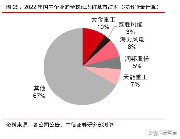 海風(fēng)基礎(chǔ)高壁壘高門檻,國(guó)內(nèi)行業(yè)格局集中。與陸上塔筒的分散格局不同,由于海上 塔筒樁基所需碼頭資源的緊缺和產(chǎn)能布局的重要性,國(guó)內(nèi)目前從事海風(fēng)塔筒和樁基生產(chǎn)的 企業(yè)較少,大金重工、海力風(fēng)電、天順風(fēng)能、潤(rùn)邦股份和泰勝風(fēng)能為主的少數(shù)領(lǐng)先企業(yè)貢 獻(xiàn)國(guó)內(nèi)的主要行業(yè)產(chǎn)能。我們根據(jù)出貨量測(cè)算,2022 年主導(dǎo)企業(yè)海力風(fēng)電、大金重工、 泰勝風(fēng)能、天能重工、潤(rùn)邦股份的海上塔筒和樁基的全球市占率合計(jì)約 30%。
