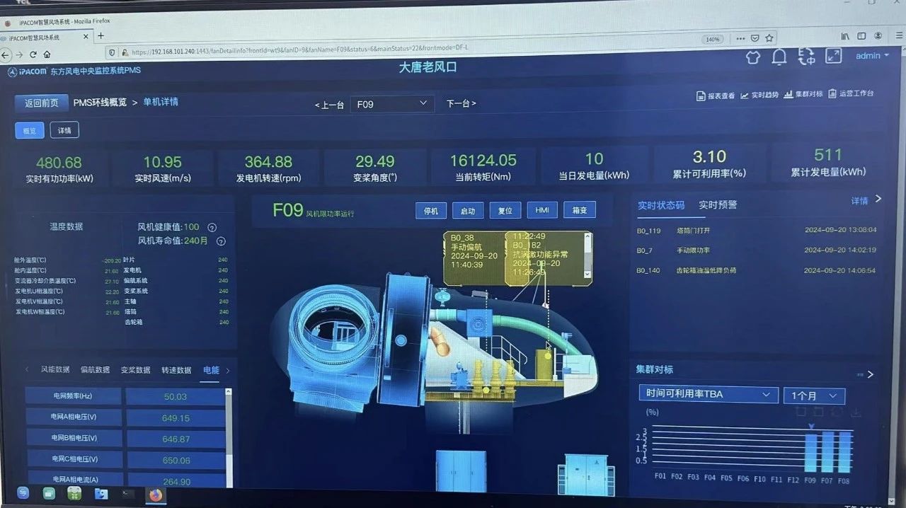 2024年9月20日14時18分,隨著現(xiàn)場總指揮一聲“啟動”指令下達,大唐塔城老風口項目9號風機徐徐轉動中控室并網(wǎng)。