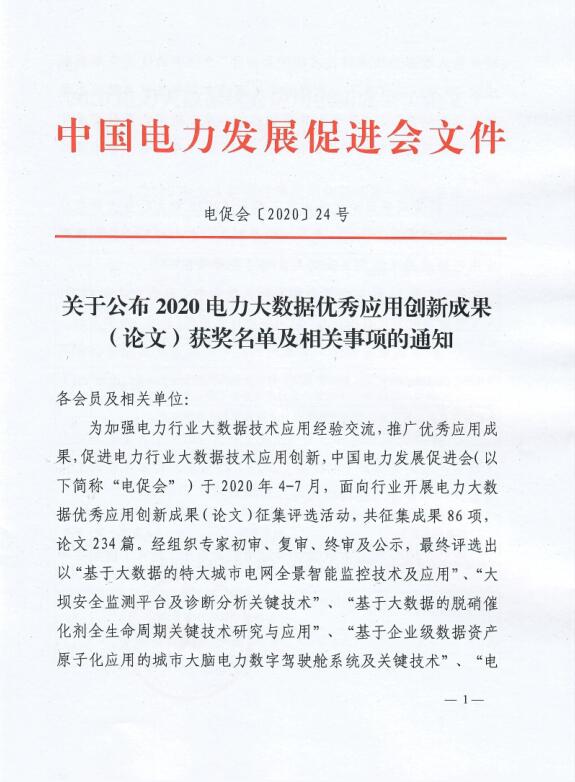 為加強電力行業(yè)大數(shù)據(jù)技術應用經(jīng)驗交流,推廣優(yōu)秀應用成果,促進電力行業(yè)大數(shù)據(jù)技術應用創(chuàng)新,中國電力發(fā)展促進會(以下簡稱“電促會”)于2020年4-7月,面向行業(yè)開展電力大數(shù)據(jù)優(yōu)秀應用創(chuàng)新成果(論文)征集評選活動,共征集成果86項,論文234篇。經(jīng)組織專家初審、復審及終審和公示,最終評選出以“基于大數(shù)據(jù)的特大城市電網(wǎng)全景智能監(jiān)控技術及應用”、“大壩安全監(jiān)測平臺及診斷分析關鍵技術”、“基于大數(shù)據(jù)的脫硝催化劑全生命周期關鍵技術研究與應用”、“基于企業(yè)級數(shù)據(jù)資產(chǎn)原子化應用的城市大腦電力數(shù)字駕駛艙系統(tǒng)及關鍵技術”、“電能質(zhì)量大數(shù)據(jù)分析關鍵技術研究及應用”為代表的優(yōu)秀應用創(chuàng)新成果39項。以“基于大數(shù)據(jù)的變壓器油中溶解氣體關鍵狀態(tài)量動態(tài)預警研究”、“基于大數(shù)據(jù)技術的小水電機組負荷分配優(yōu)化平臺研究及應用”為代表的優(yōu)秀論文74篇。現(xiàn)將有關事項通知如下: