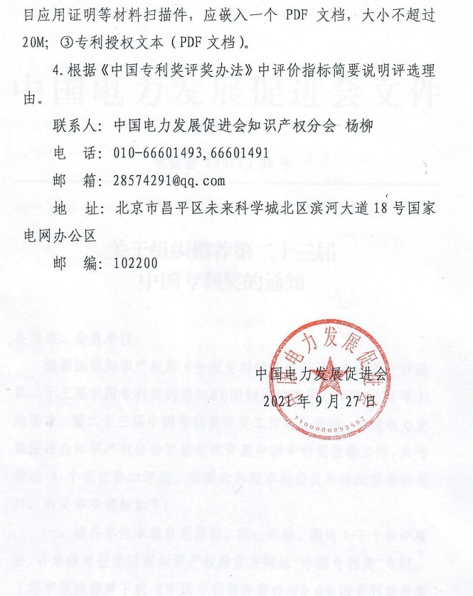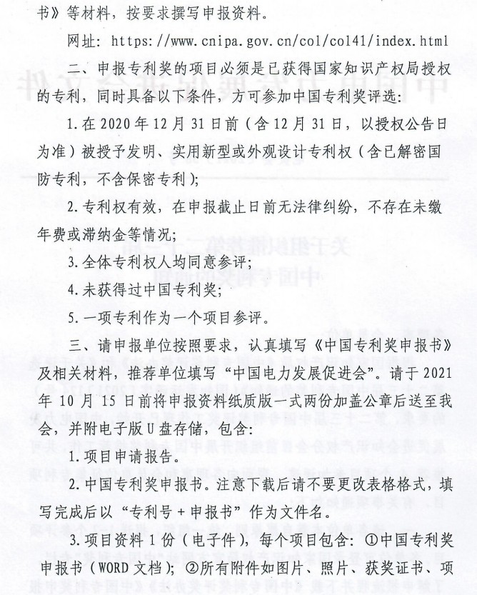 三、請申報單位按照要求,認真填寫《中國專利獎申報書》及相關(guān)材料,推薦單位填寫“中國電力發(fā)展促進會”。請于2021年10月15日前將申報資料紙質(zhì)版一式兩份加蓋公章后送至我會,并附電子版U盤存儲,包含: