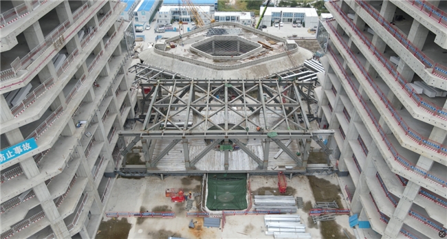 突破常規(guī),技術(shù)創(chuàng)新引領(lǐng)千噸連廊平地起。為降低施工風(fēng)險(xiǎn)、提高施工效率,項(xiàng)目根據(jù)國(guó)內(nèi)外類(lèi)似工程建造經(jīng)驗(yàn),查閱大量國(guó)內(nèi)外相關(guān)專業(yè)資料,逐一攻克了鋼結(jié)構(gòu)轉(zhuǎn)換胎架拼裝平臺(tái)免回頂技術(shù)、鋼結(jié)構(gòu)桁架預(yù)起拱技術(shù)、鋼連廊結(jié)構(gòu)自提升技術(shù)、鋼連廊液壓整體提升技術(shù),為鋼結(jié)構(gòu)連廊施工全過(guò)程提供技術(shù)保障。