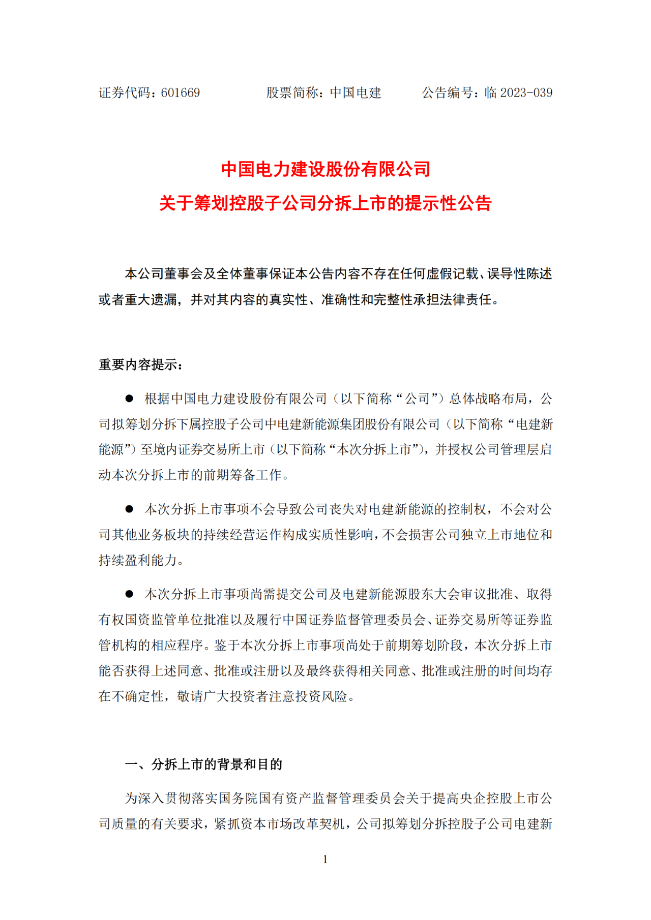 6月2日晚間,中國電力建設(shè)股份有限公司發(fā)布《關(guān)于籌劃控股子公司分拆上市的提示性公告》,擬將旗下中電建新能源集團股份有限公司拆分至境內(nèi)上市,中國電建以新能源為核心的戰(zhàn)略轉(zhuǎn)型升級進程,邁出了最關(guān)鍵一步。
