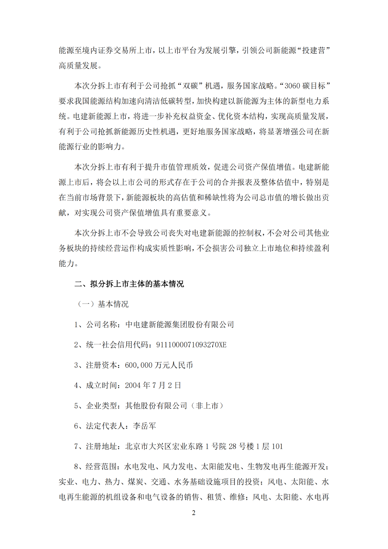根據(jù)公告,擬拆分的中電建新能源集團股份有限公司注冊資本為60億元,經(jīng)營范圍包括水電發(fā)電、風力發(fā)電、太陽能發(fā)電、生物發(fā)電再生能源開發(fā)等。