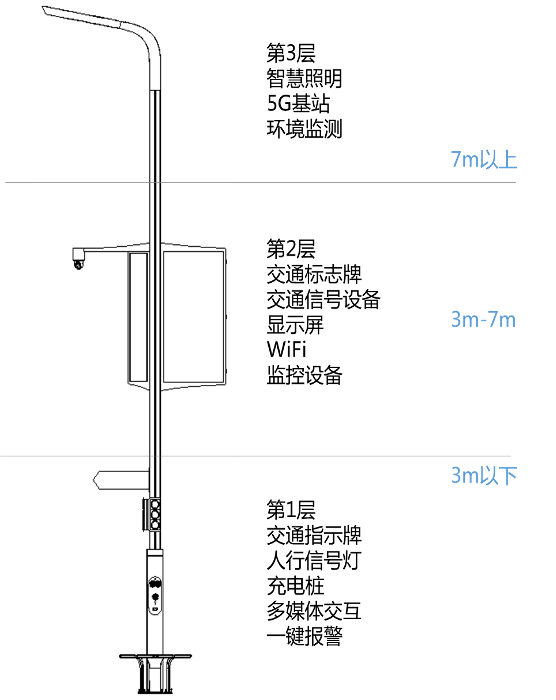 中電啟明星所開發(fā)的智慧路燈主要采用模塊化分層級(jí)的桿體設(shè)計(jì),將路燈桿體分為頂部(>7米)、中部(3-7米)、下部(<3米)三個(gè)層次: