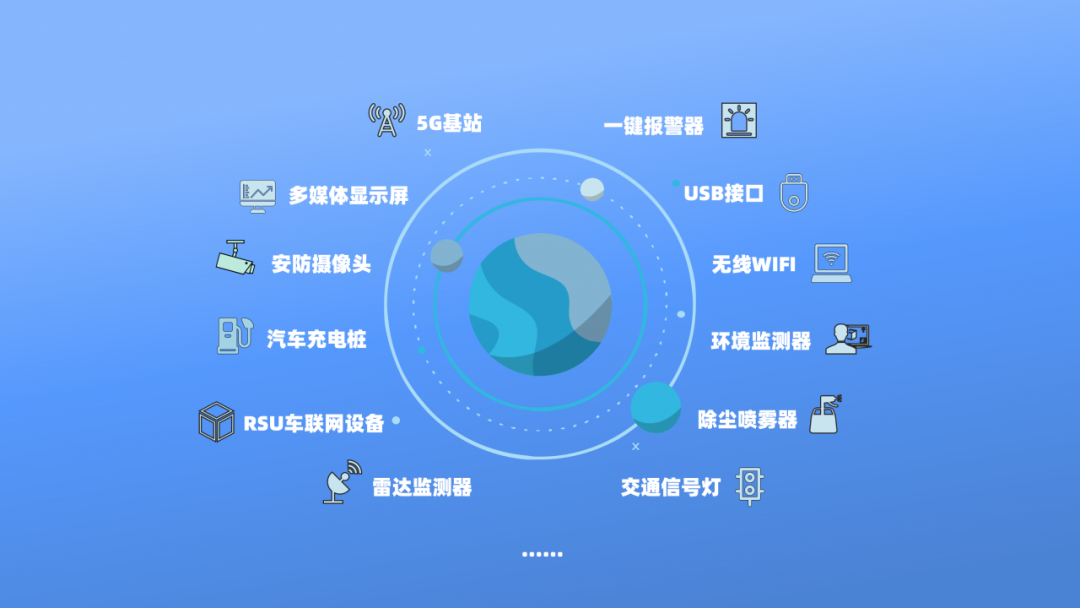 在不同高位層次里規(guī)劃部署相應(yīng)的智能化設(shè)備,包括但不限于5G基站、多媒體顯示屏、安防攝像頭、交通信號(hào)燈、充電樁、一鍵呼叫等數(shù)十類設(shè)備。每一層次里的設(shè)備都可靈活更換、拆卸;桿體內(nèi)匹配相應(yīng)的電容器和智能斷路器,在配電側(cè)整合強(qiáng)弱電機(jī)柜,安裝智能門鎖、溫度監(jiān)測(cè),實(shí)行低壓供電,分級(jí)控制,充分滿足個(gè)性化的場(chǎng)景應(yīng)用需求。