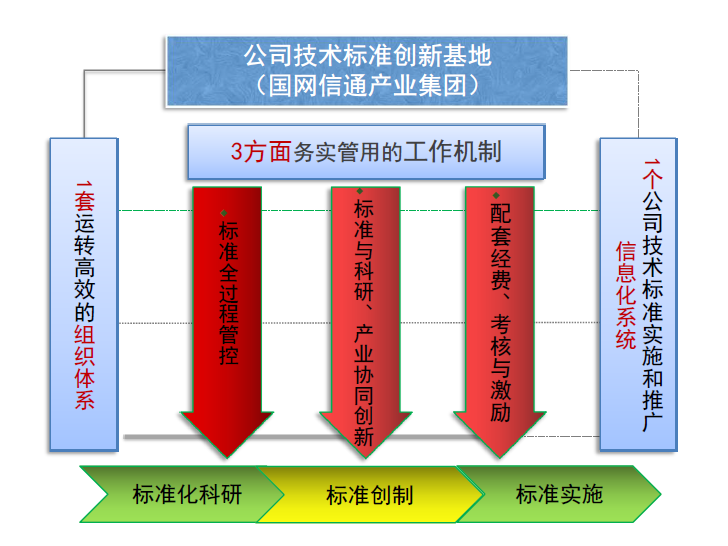 該創(chuàng)新基地基于2019籌建工作基礎(chǔ),進(jìn)一步健全了“1+3+1”組織體系和工作機(jī)制(即:以搭建一套運(yùn)轉(zhuǎn)高效的組織體系為核心,以構(gòu)設(shè)“標(biāo)準(zhǔn)全過程管控,標(biāo)準(zhǔn)與科研、產(chǎn)業(yè)協(xié)同創(chuàng)新,配套經(jīng)費(fèi)、考核與激勵”三方面務(wù)實(shí)管用的工作機(jī)制為抓手,以建設(shè)完善一個公司技術(shù)標(biāo)準(zhǔn)實(shí)施和推廣信息化系統(tǒng)為依托,統(tǒng)籌推進(jìn)創(chuàng)新基地各項(xiàng)任務(wù))。完善“標(biāo)準(zhǔn)全過程管控,標(biāo)準(zhǔn)與科研、產(chǎn)業(yè)協(xié)同創(chuàng)新,配套經(jīng)費(fèi)、考核與激勵”三方面工作機(jī)制。搭建了國家電網(wǎng)公司技術(shù)標(biāo)準(zhǔn)體系本地?cái)?shù)據(jù)庫和技術(shù)標(biāo)準(zhǔn)實(shí)施評價(jià)信息化平臺,完成公司制度標(biāo)準(zhǔn)智能管理平臺建設(shè),構(gòu)建了首個電力行業(yè)標(biāo)準(zhǔn)與制度知識圖譜庫,初步形成“電網(wǎng)全業(yè)務(wù)神經(jīng)網(wǎng)絡(luò)”