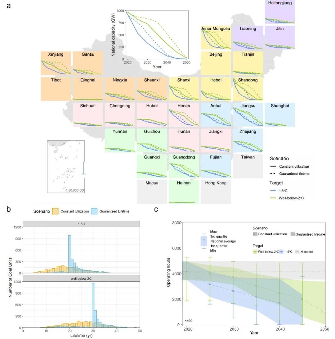 為實現(xiàn)《巴黎協(xié)定》氣候目標(biāo),未來30年中國需要在燃煤發(fā)電行業(yè)實現(xiàn)深度減排,并達(dá)到凈零排放。近期發(fā)表于《自然-通訊》上的研究對中國實現(xiàn)氣候目標(biāo)和減排途徑的可行性展開了分析,研究者們首先依據(jù)技術(shù)屬性、盈利能力、環(huán)境影響對中國1037個現(xiàn)役燃煤電廠的退役優(yōu)先級進(jìn)行逐一評估,并結(jié)合全球升溫1.5°C和2°C目標(biāo)情景,提出了可持續(xù)的中國燃煤電廠退出路徑選擇。研究發(fā)現(xiàn),為實現(xiàn)氣候目標(biāo),中國需要在短期內(nèi)停止新建燃煤電廠,優(yōu)先退役落后產(chǎn)能,可以通過降低利用小時,保障大部分機(jī)組20年(1.5°C目標(biāo))或30年(2°C目標(biāo))的運行年限,并在2045年(1.5°C目標(biāo))或2055年(2°C目標(biāo))前實現(xiàn)全面的煤電退出。