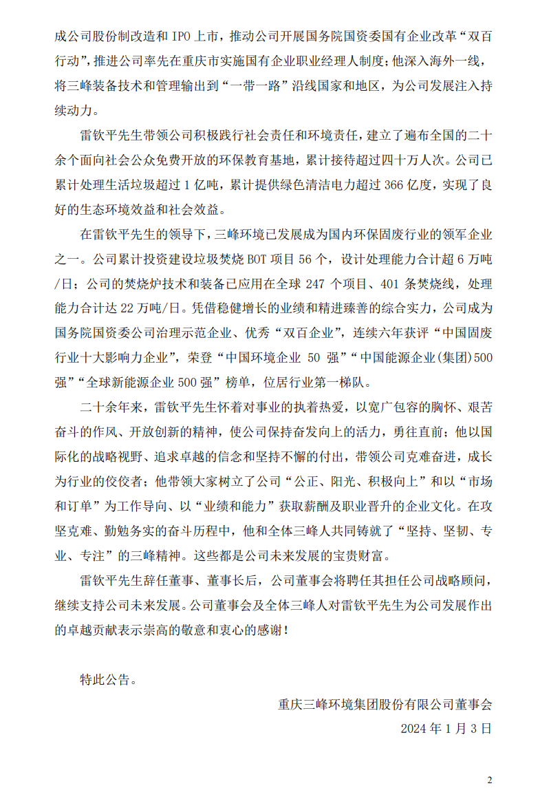 1月3日,三峰環(huán)境發(fā)布公告稱,公司董事會于近日收到董事長雷欽平先生的書面辭職申請。根據(jù)《重慶三峰環(huán)境集團股份有限公司董事長任期制和契約化管理方案》,雷欽平董事長的聘任期限至2023年11月26日止,任期考核等級為A(優(yōu)秀),現(xiàn)因臨近退休,申請辭去公司董事、董事長職務(wù)。