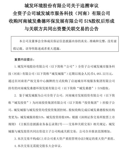 5月10日,城發(fā)環(huán)境公告,為進(jìn)一步擴(kuò)大省內(nèi)環(huán)衛(wèi)產(chǎn)業(yè)市場(chǎng)份額,同時(shí)減少同業(yè)競(jìng)爭(zhēng),公司全資子公司城發(fā)城服近期以現(xiàn)金人民幣4483.22萬(wàn)元,通過(guò)在河南省產(chǎn)權(quán)交易中心摘牌的方式收購(gòu)了啟迪城市環(huán)境服務(wù)集團(tuán)有限公司持有的河南城發(fā)桑德環(huán)保發(fā)展有限公司51%股權(quán)。