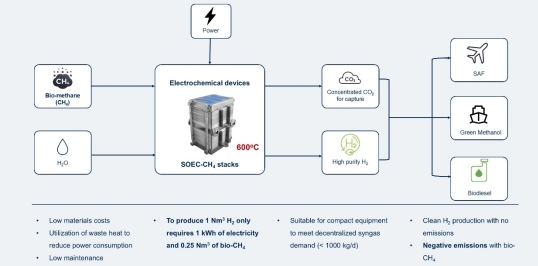 采用更先進(jìn)的電化學(xué)路線,將生物天然氣、綠電、水輸入電堆,在600℃運(yùn)行溫度下,同時(shí)產(chǎn)出高純度綠氫和自富集的CO2,一次性解決綠色燃料合成時(shí)的兩大重點(diǎn)原料的來源問題。不僅簡化了流程,更縮減了成本。在其他項(xiàng)目仍在使用其他電解水制氫裝備,以3-5度/標(biāo)方的電耗制取綠氫,同時(shí)增設(shè)空氣捕集裝置來捕集CO2時(shí)。電堆科技已經(jīng)做到,制取1標(biāo)方氫氣,僅需1度電及0.25標(biāo)方生物天然氣,且無需增設(shè)空氣捕集裝置。