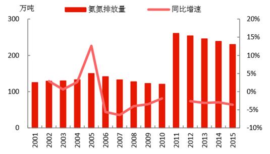 經(jīng)過“十二五”的治理,四項污染物減排約束性指標均實現(xiàn)了持續(xù)下降,完成了“十二五”的減排任務(wù),取得了一定的環(huán)保成果。2015年:1)COD的排放量為2224萬噸,且每年以3%左右的速度下降;2)氨氮的排放量為230萬噸,且每年以3%左右的速度下降;3)SO2的排放量為1859萬噸,每年基本以4%左右的速度下降,而收關(guān)年2015年下降速度高達5.84%;4)NOx的排放量為1852萬噸,“十二五”剛開始治理,當前的下降速度還處于上升趨勢,收關(guān)年2015年下降速度高達10.89%。