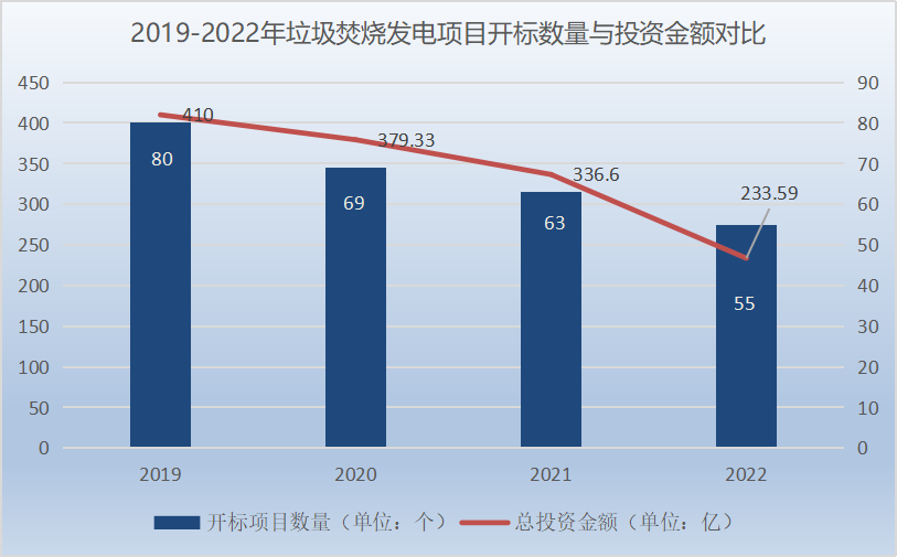 垃圾焚燒發(fā)電行業(yè)在歷經(jīng)“跑馬圈地”、“搶裝潮”等時期后,進入冷靜發(fā)展期。北極星固廢網(wǎng)統(tǒng)計了2019年-2022年的垃圾焚燒發(fā)電項目開標(biāo)數(shù)量以及投資總額,整體呈逐年下滑趨勢。