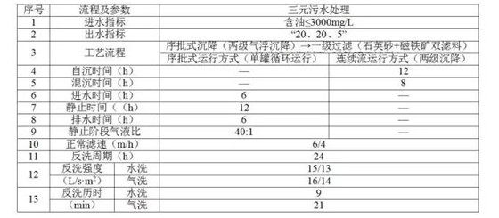 三采污水站分為普通聚驅(qū)污水站、高濃度聚驅(qū)污水站、三元污水站等,普通聚驅(qū)污水處理工藝流程與普通污水處理工藝流程相同,只是在過(guò)濾介質(zhì)、技術(shù)界限及工藝參數(shù)上做出調(diào)整。過(guò)濾介質(zhì)選擇適合含聚污水處理使用的石英砂、磁鐵礦等。當(dāng)含聚污水中聚合物濃度高于450mg/L時(shí),采用高濃度聚驅(qū)污水處理工藝,主要區(qū)別在于增加了沉降時(shí)間,過(guò)濾罐由石英砂改為石英砂磁鐵礦雙濾料過(guò)濾工藝。當(dāng)處理含表活劑、聚合物、堿的三元污水時(shí)采用“連續(xù)流氣浮、序批曝氣沉降、石英砂磁鐵礦、海綠石磁鐵礦過(guò)濾”處理工藝三元污水處理工藝。