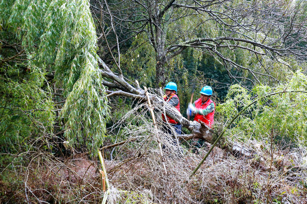 中國電力網(wǎng)訊 “123…加油!123…加油!大家注意安全,控制好繩索方向,千萬不要讓樹壓在線上……”12月15日,在10千伏坪溪Ⅱ線坪嚴支線湖竹坪次支,國網(wǎng)樂安縣供電公司共產(chǎn)黨員服務隊隊員正在清理覆冰線路通道外的樹木,保障低溫冰凍天氣電網(wǎng)安全穩(wěn)定運行。