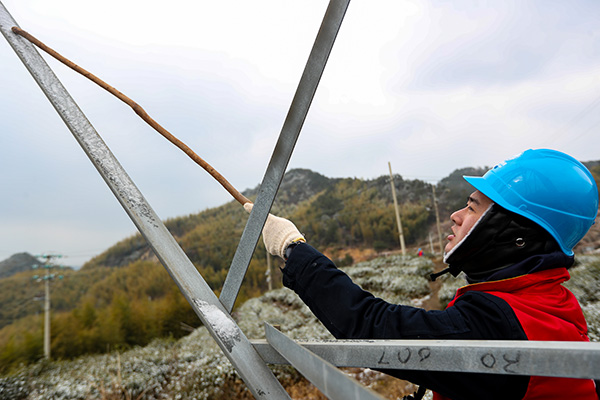巡線員們一路踏冰前行,一路巡視線路和鐵塔,每到一基桿塔就利用望遠(yuǎn)鏡、測(cè)距儀等工具詳細(xì)監(jiān)測(cè)冰情,仔細(xì)觀察是否有安全隱患,并用手機(jī)拍攝下來(lái),同時(shí)也對(duì)基礎(chǔ)、導(dǎo)地線、桿塔、金具絕緣子及接地裝置進(jìn)行了全面“問(wèn)診”。如果遇到樹竹倒伏在線路上方位,還要現(xiàn)場(chǎng)進(jìn)行清理,以免影響線路的安全穩(wěn)定運(yùn)行。