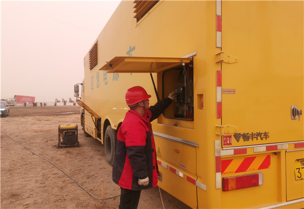 開工儀式當(dāng)天沙塵天氣持續(xù),揚沙隨風(fēng)彌漫,突擊隊的保電人員不辭辛苦一大早便提前進(jìn)入會場。將發(fā)電車??吭谇捌诓榭钡闹付ㄎ恢?,做好安全監(jiān)護(hù)相關(guān)的工作之后,啟動車輛試運行,檢查了各項儀表數(shù)據(jù),并做好與用戶側(cè)供電設(shè)備的對接,全力以赴投入保電工作。該分局領(lǐng)導(dǎo)帶領(lǐng)保電人員全程守候在現(xiàn)場,隨時應(yīng)對突發(fā)停電事故的發(fā)生,確保了開工儀式用電萬無一失。