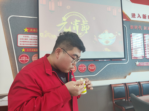 緊接著,趣味小游戲的開始又將整場活動掀起另一個高潮。為冬奧會吉祥物“冰墩敦”貼眼睛,展現(xiàn)了職工團(tuán)隊(duì)協(xié)作能力;“扮時鐘”體現(xiàn)了職工對時間觀念的認(rèn)知;最后的“聲聲報(bào)福”展現(xiàn)了職工的配合默契程度。歡聲笑語過后,大家每人一碗熱乎乎湯圓,寓意著“團(tuán)團(tuán)圓圓”,同時也祝愿全體職工在新的一年里能夠更加團(tuán)結(jié)奮進(jìn),砥礪前行。