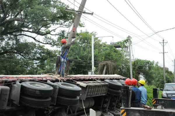 中國電力網(wǎng)訊 9月19日上午9點(diǎn)20分,由于一場(chǎng)意外的交通事故,10千伏夢(mèng)谷線76#桿被一輛側(cè)翻的貨車壓倒。而10千伏夢(mèng)谷線主要承擔(dān)廣昌縣夢(mèng)谷電商創(chuàng)業(yè)園以及附近答田村數(shù)個(gè)村小組的供電任務(wù),情況緊急,國網(wǎng)廣昌縣供電公司甘竹供電所在接到搶修工單的第一時(shí)間立即啟動(dòng)應(yīng)急搶修預(yù)案,組織了一只數(shù)十人的搶修隊(duì)伍前往事故發(fā)生地點(diǎn),并在趕往現(xiàn)場(chǎng)的同時(shí),安排相關(guān)臺(tái)區(qū)管理員做好停電用戶解釋工作。