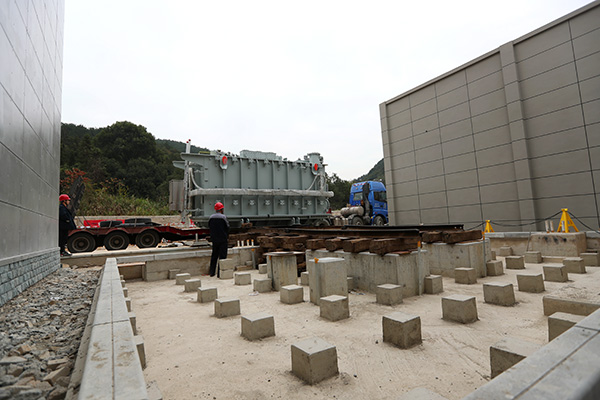 考慮到近期受山東青島疫情影響,國(guó)網(wǎng)寧海縣供電公司對(duì)來(lái)自山東菏澤地區(qū)的運(yùn)輸單位人員提前進(jìn)行了移動(dòng)軌跡審查備案,并在工地現(xiàn)場(chǎng)開(kāi)展測(cè)溫消毒,為冬季疫情防控做足了充分準(zhǔn)備。在各參建單位的周密部署下,經(jīng)過(guò)兩天復(fù)雜的步驟和精細(xì)的操作,兩臺(tái)主變順利卸裝就位,主變就位精準(zhǔn)、成品保護(hù)及現(xiàn)場(chǎng)環(huán)境滿足相關(guān)規(guī)范要求。