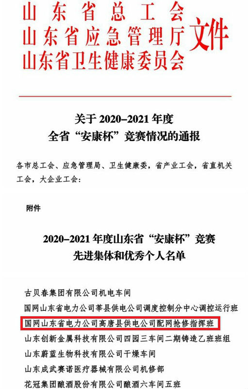 近日,從山東省總工會(huì)獲悉,高唐公司配網(wǎng)搶修指揮班獲評(píng)2020-2021年度全省“安康杯”競(jìng)賽優(yōu)勝班組,全省共評(píng)選出60個(gè)班組,其中供電系統(tǒng)共有5個(gè)班組獲此殊榮。