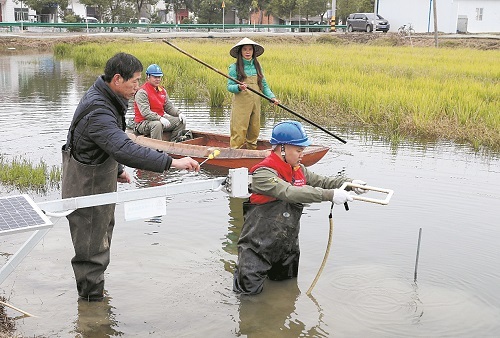 國網(wǎng)湖北潛江供電公司員工在蝦田安裝水質(zhì)監(jiān)測設(shè)備。