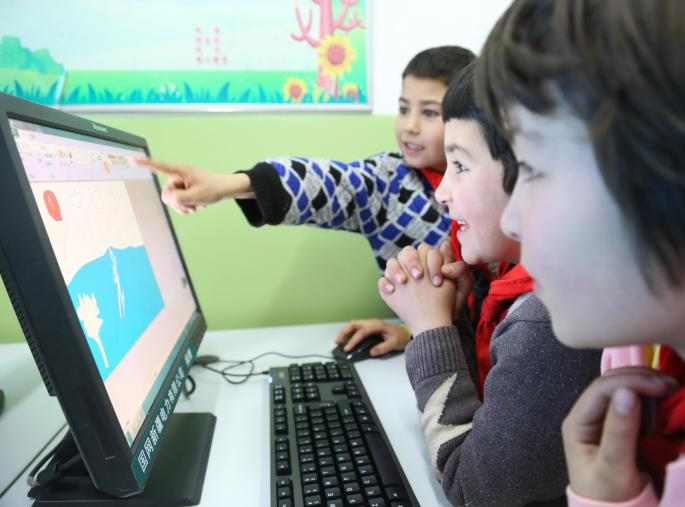 馬爾洋鄉(xiāng)中心小學的孩子們用國網(wǎng)新疆電力捐贈的電腦學習繪畫