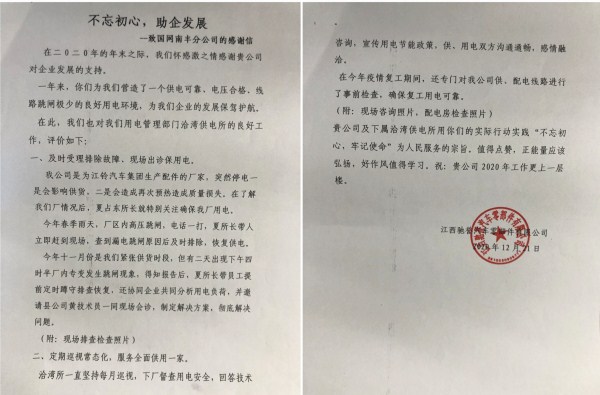 中國(guó)電力網(wǎng)訊 12月21日,國(guó)網(wǎng)南豐縣供電公司收到江西馳譽(yù)汽車零部件有限公司送來的感謝信,對(duì)該公司提供的良好用電環(huán)境表示衷心感謝。