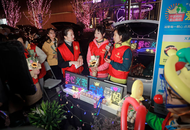 “我們下午15時就到廣場開始布置了。”張亞芬說,當天下午她帶著丈夫、女兒和公司10多位志愿者早早地在寒風里做起了義賣前準備工作。雞蛋、鮮花、智能感應(yīng)燈,所有的義賣商品擺放得齊齊整整。晚上18時,隨著音樂的響起,公益義賣正式開始,過往的行人來到“寧波媽媽”公益攤位前選購起來。