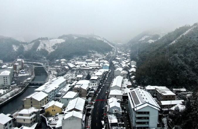 以四明山鎮(zhèn)為中心的天空里,雪花飛舞。環(huán)顧四周,大大小小的山頭已經落滿了積雪,壓得竹林深深地彎下了腰,鄉(xiāng)間白墻黛瓦的屋檐上,已經掛滿了長長的冰凌,推開窗戶哈一口白氣,就能感受到冬天的寒冷。