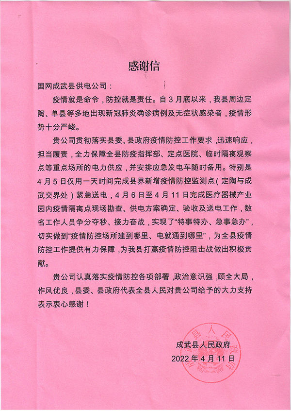 感謝信中說,自3月底以來,疫情形勢十分嚴峻,成武公司貫徹落實縣委、縣政府疫情防控工作要求,迅速響應(yīng)擔(dān)當(dāng)履責(zé)。工作人員爭分奪秒、接力奮戰(zhàn),實現(xiàn)了“特事特辦、急事急辦”切實做到“疫情防控場所建到哪里、電就通到哪里",全力保障全縣防疫指揮部、定點醫(yī)院、臨時隔離觀察點等重點場所的電力供應(yīng),并安排應(yīng)急發(fā)電車隨時備用,體現(xiàn)了政治意識強,顧全大局的優(yōu)良作風(fēng)。