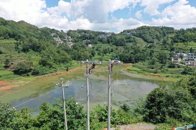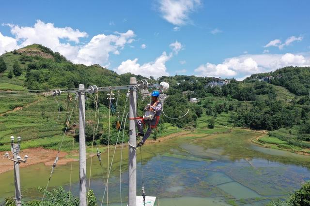 南方電網(wǎng)興仁供電局工作人員對新田水庫10千伏龍麻線新田支線線纜進行緊線操作。