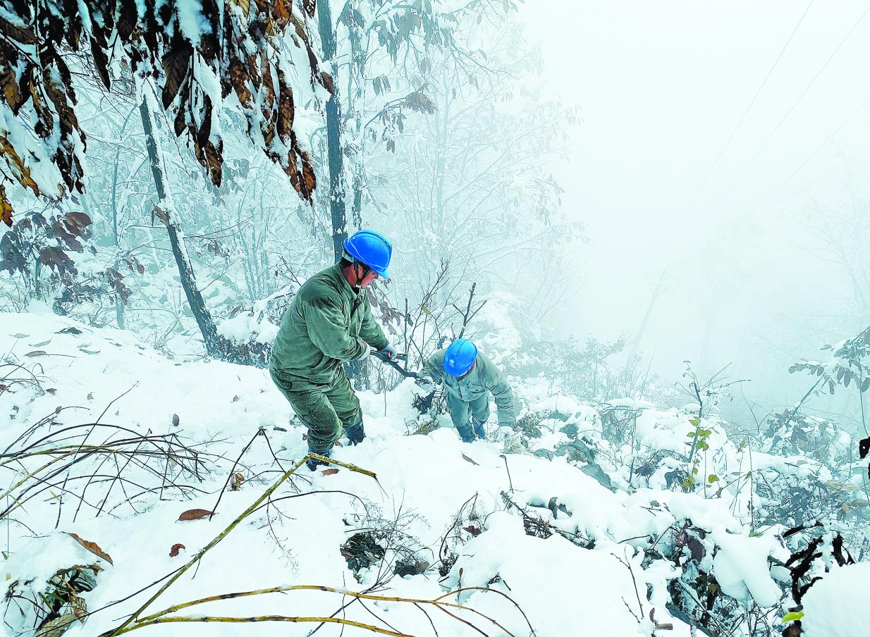 國網(wǎng)鄖西縣供電公司員工在齊膝深的積雪中艱難跋涉,清理線下覆冰嚴重的樹木隱患。