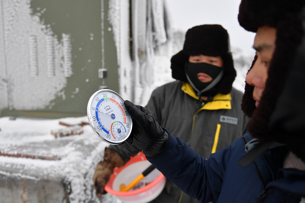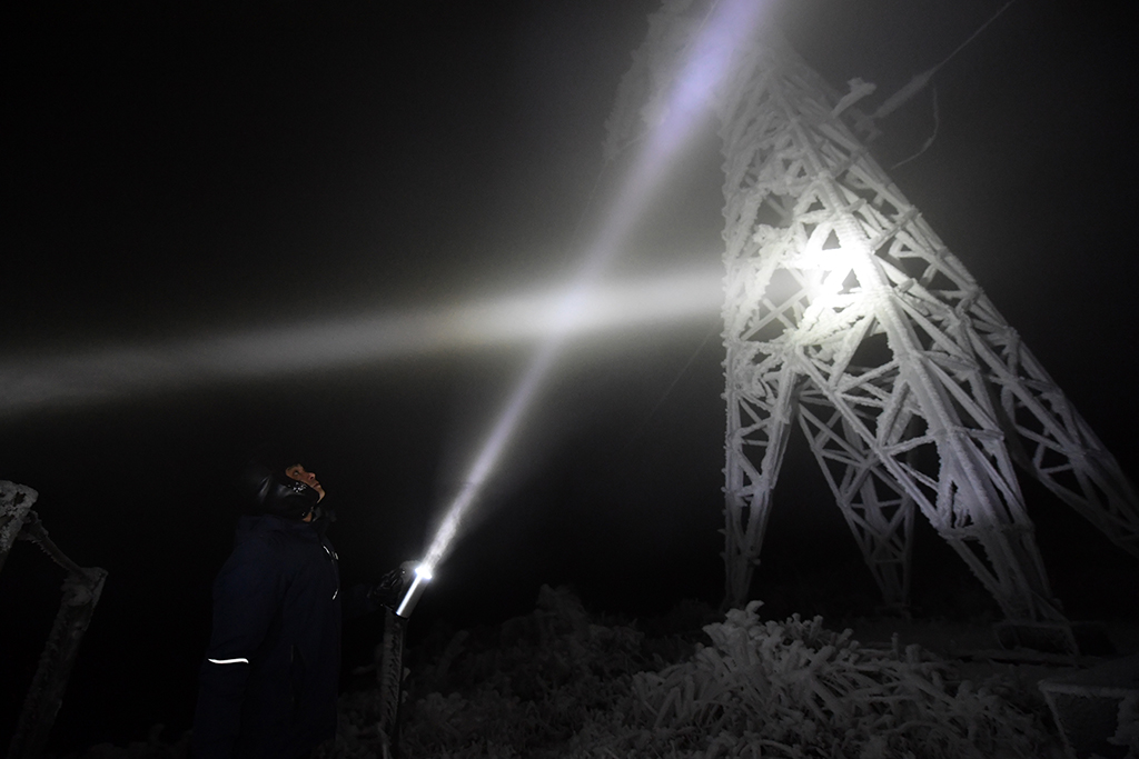 12月19日,尹斌(右)和龍昱君前往110千伏西公線003號監(jiān)測哨所觀測冰情。新華社記者 陳振海 攝海拔1420米的西晃山,位于湖南省懷化市芷江侗族自治縣和麻陽苗族自治縣交界處。110千伏西公線是西晃山風(fēng)電場升壓站至220千伏公坪變電站的送電線路工程,為懷化地區(qū)提供電能,每年都是湖南省內(nèi)最早結(jié)冰的輸電線路之一。