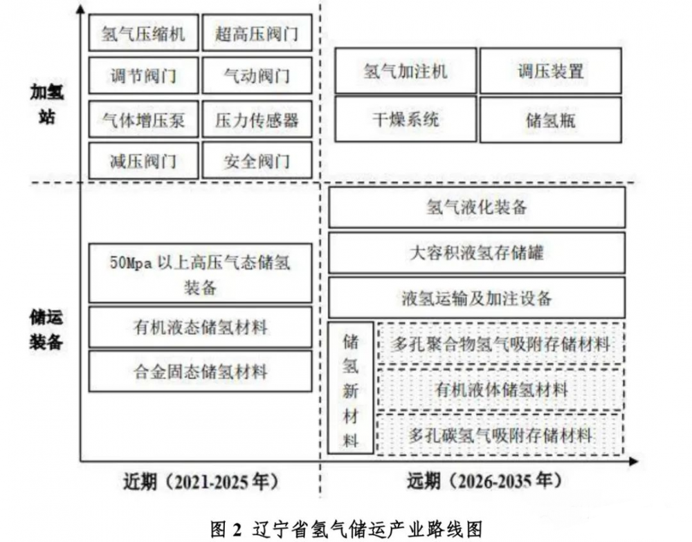 近期(2021-2025年),重點發(fā)展50兆帕以上高壓氣態(tài)儲氫裝備和低溫液態(tài)儲氫裝備,同時開展有機液態(tài)儲氫、合金固態(tài)儲氫等儲氫材料的研發(fā)和生產。遠期(2026-2035年),積極發(fā)展氫氣液化裝備、大容積液氫存儲罐、液氫運輸及加注設備等儲氫裝備,同時開展有機液體儲氫材料、多孔碳氫氣吸附存儲材料、多孔聚合物氫氣吸附存儲材料的研發(fā)和生產。