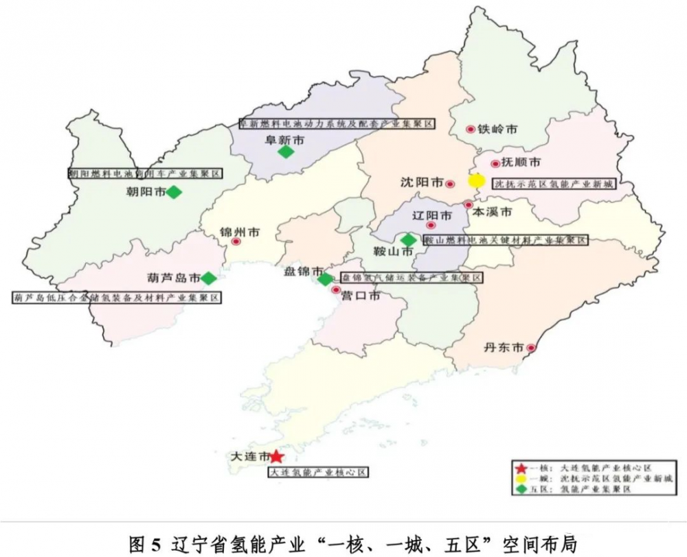 根據遼寧省現有氫能產業(yè)發(fā)展基礎,以“合理集聚、產業(yè)協同、政企聯動、互為支撐”為原則進行空間布局和優(yōu)化,著力構建“一核、一城、五區(qū)”的氫能產業(yè)空間發(fā)展格局。一核即大連氫能產業(yè)核心區(qū),一城即沈撫示范區(qū)氫能產業(yè)新城,五區(qū)分別是鞍山燃料電池關鍵材料產業(yè)集聚區(qū)、朝陽燃料電池商用車產業(yè)集聚區(qū)、阜新燃料電池動力系統(tǒng)及配套產業(yè)集聚區(qū)、葫蘆島低壓合金儲氫裝備及材料產業(yè)集聚區(qū)和盤錦氫氣儲運裝備產業(yè)集聚區(qū)。