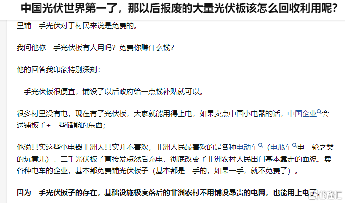 知乎有這么一個(gè)問(wèn)題“中國(guó)光伏世界第一了,那以后報(bào)廢的大量光伏板該怎么回收利用呢?”,上圖是其中的一個(gè)回答。至少,中國(guó)的新能源已經(jīng)開(kāi)始改變非洲了。