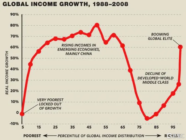 這就是那條著名的“大象曲線”,反映了全球收入的不平等狀況。從1988年到2008這20年間,收入增長(zhǎng)最快的有兩部分人,一部分是發(fā)達(dá)國(guó)家那1%的全球化精英,另一部分是發(fā)展中國(guó)家的中產(chǎn)階級(jí),尤其是中國(guó)。有贏就有輸,相對(duì)的輸家就是發(fā)達(dá)國(guó)家的中產(chǎn)階級(jí)和中下層階級(jí)。