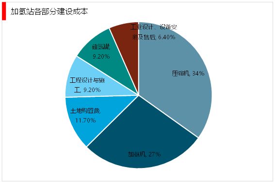加氫站主要由制氫系統(tǒng)、壓縮系統(tǒng)、儲存系統(tǒng)、加注系統(tǒng)和控制系統(tǒng)等部分組成。從成本結(jié)構(gòu)來看,壓縮機成本和土地購置費的成本占比最高,分別為34%和27%;儲氫罐成本占比11.7%;加氫機成本占比9.2%。