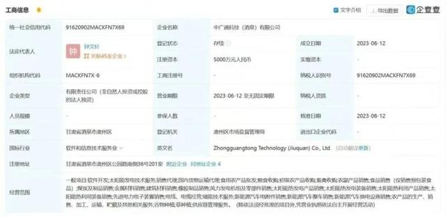 簽署合作協(xié)議僅5天,中廣通科技(酒泉)有限公司成立。根據(jù)天眼查顯示,該公司地址位于酒泉市肅州區(qū)公園路36號(hào)201室。