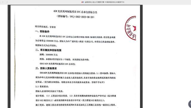 通報(bào)還稱,6月12日,該公司在區(qū)市場(chǎng)監(jiān)管局注冊(cè)全資子公司中廣通科技(酒泉)有限公司。6月13日,中廣通科技(酒泉)有限公司工作人員嚴(yán)微明向項(xiàng)目聯(lián)系人、區(qū)工信局副局長(zhǎng)馬斌提交公司營業(yè)執(zhí)照復(fù)印件、《“離網(wǎng)制氫”項(xiàng)目投資合作協(xié)議》兩份資料,由馬斌代其在甘肅省政務(wù)網(wǎng)在線審批監(jiān)管平臺(tái)提交了項(xiàng)目備案申請(qǐng),區(qū)發(fā)改局政務(wù)大廳首席代表李倩在向分管領(lǐng)導(dǎo)王泉德匯報(bào),并向酒泉新能源綜合利用產(chǎn)業(yè)園管理辦公室副主任閆斌征求意見后,為該公司辦理了項(xiàng)目備案。6月21日,中廣通科技(酒泉)有限公司在未進(jìn)行項(xiàng)目可行性研究,未辦理項(xiàng)目規(guī)劃、土地、環(huán)評(píng)等前期手續(xù),也未與相關(guān)部門溝通的情況下,在“中國招投標(biāo)公共服務(wù)平臺(tái)”發(fā)布了《4GW光伏離網(wǎng)制氫項(xiàng)目EPC總承包招標(biāo)公告》。