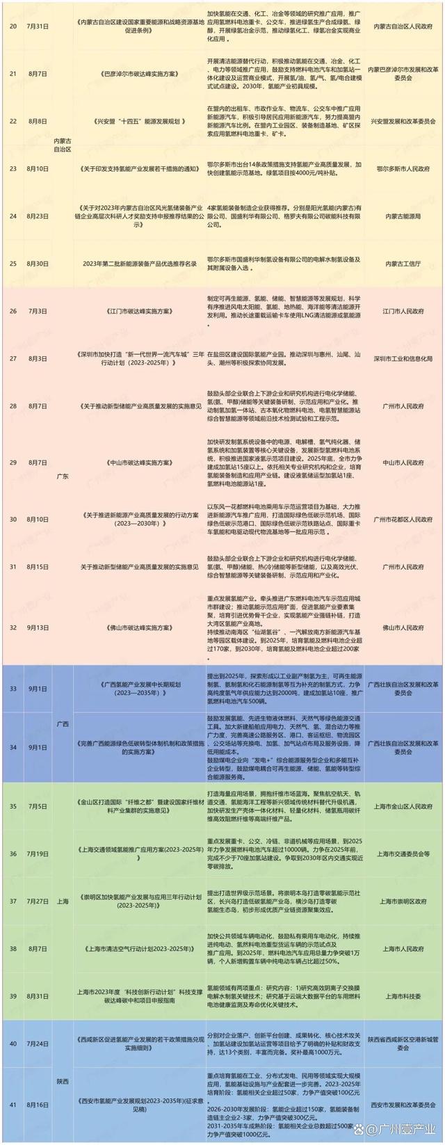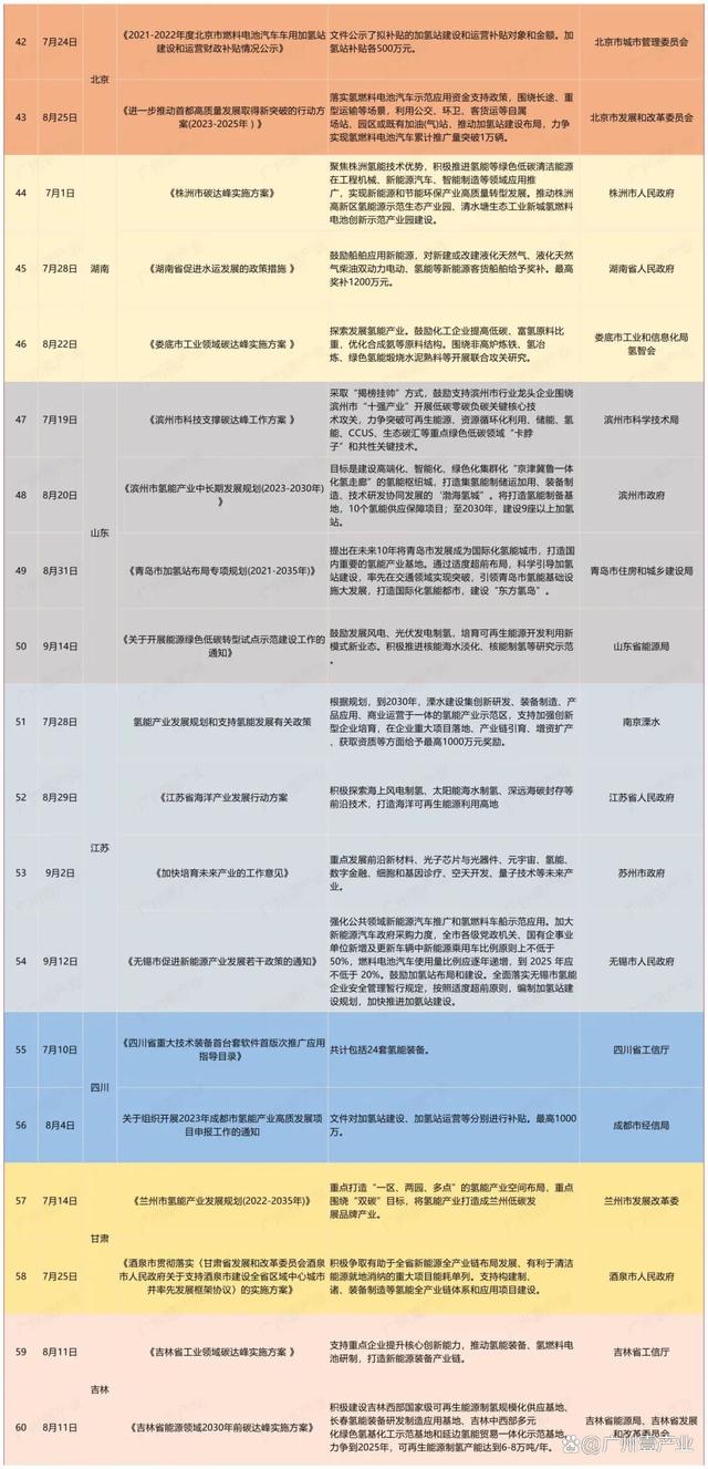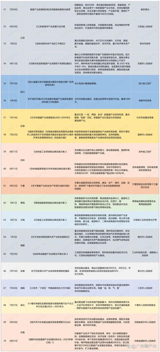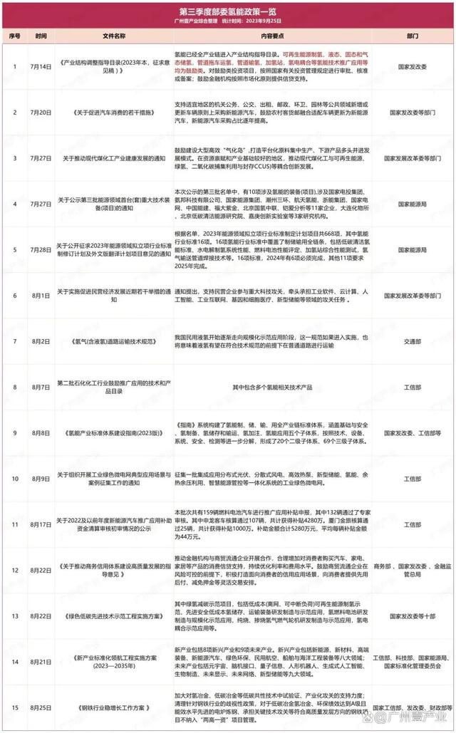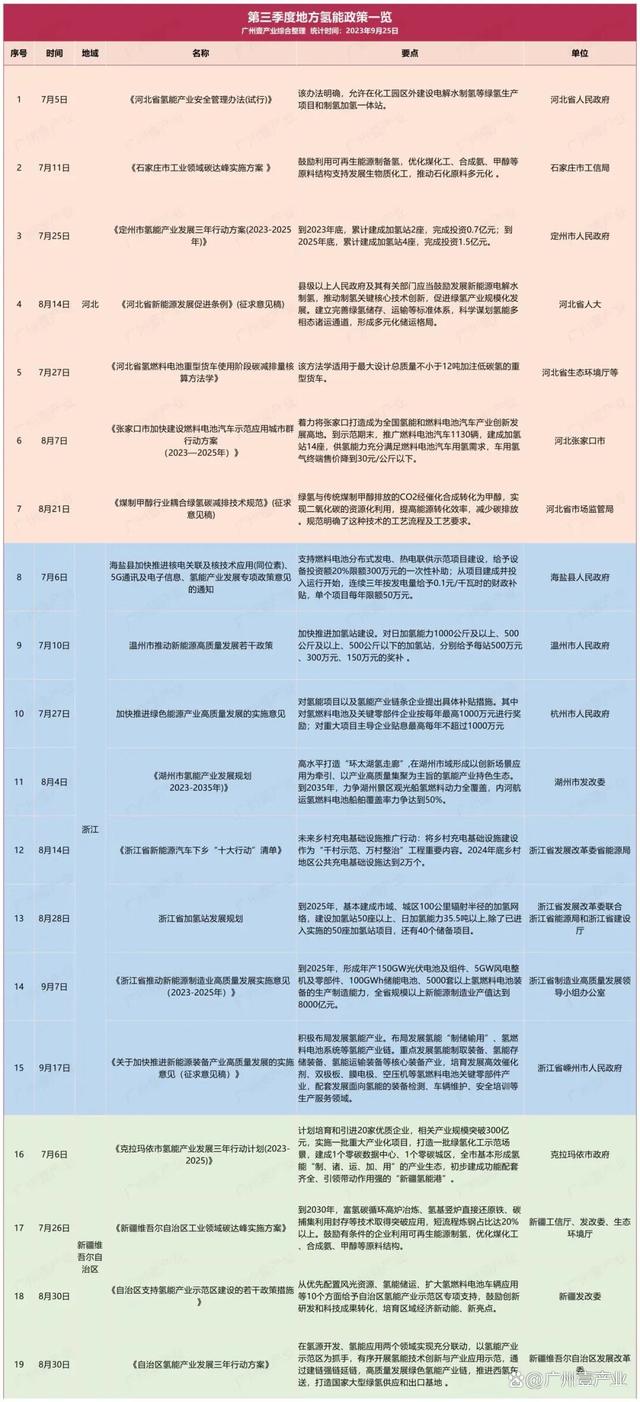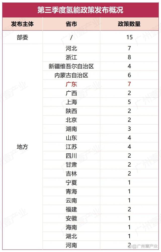 9月17日,浙江省嵊州市人民政府發(fā)布了《關(guān)于加快推進(jìn)新能源裝備產(chǎn)業(yè)高質(zhì)量發(fā)展的實(shí)施意見(征求意見稿)》。其中提到,積極布局發(fā)展氫能產(chǎn)業(yè)。布局發(fā)展氫能“制儲(chǔ)輸用”、氫燃料電池系統(tǒng)等氫能產(chǎn)業(yè)鏈。9月14日,山東省能源局發(fā)布了《關(guān)于開展能源綠色低碳轉(zhuǎn)型試點(diǎn)示范建設(shè)工作的通知》。文件中涉及到氫能的內(nèi)容有:鼓勵(lì)發(fā)展風(fēng)電、光伏發(fā)電制氫,培育可再生能源開發(fā)利用新模式新業(yè)態(tài);積極推進(jìn)核能海水淡化、核能制氫等研究示范等。9月13日,佛山市人民政府印發(fā)了《佛山市碳達(dá)峰實(shí)施方案》的通知。方案中提到,重點(diǎn)發(fā)展氫能產(chǎn)業(yè)。牽頭推進(jìn)廣東燃料電池汽車示范應(yīng)用城市群建設(shè),強(qiáng)化城市群內(nèi)各市資源共享、優(yōu)勢(shì)互補(bǔ)。加強(qiáng)氫能基礎(chǔ)設(shè)施建設(shè)。推動(dòng)氫能示范應(yīng)用擴(kuò)面,促進(jìn)氫能產(chǎn)業(yè)要素集聚,培育引進(jìn)優(yōu)勢(shì)骨干企業(yè),實(shí)現(xiàn)氫能產(chǎn)業(yè)強(qiáng)鏈補(bǔ)鏈,打造大灣區(qū)氫能產(chǎn)業(yè)高地。持續(xù)推動(dòng)南海區(qū)“仙湖氫谷”、一汽解放南方新能源汽車基地等園區(qū)載體建設(shè)。到2025年,培育氫能及燃料電池企業(yè)超過170家,到2030年,培育氫能及燃料電池企業(yè)超過200家。......據(jù)廣州壹產(chǎn)業(yè)不完全統(tǒng)計(jì),截至9月25日,今年第三季度(7、8、9月),部委共發(fā)布15條與氫能相關(guān)的政策,地方則有23個(gè)省(市)發(fā)布了70條氫能政策,合計(jì)85條。