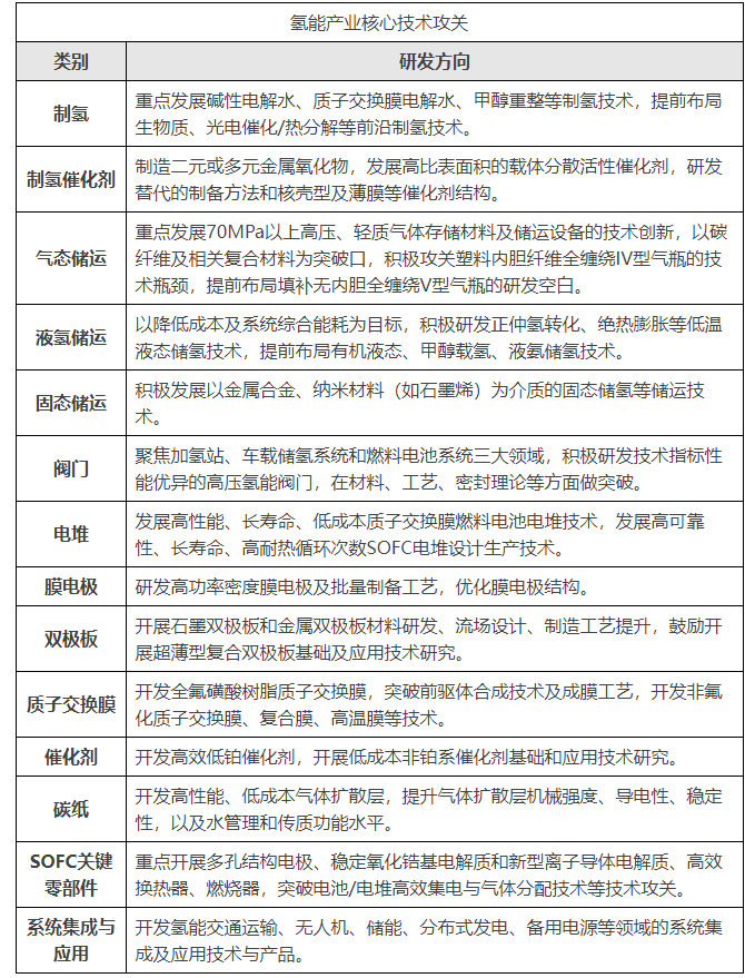 1.加快核心關(guān)鍵技術(shù)研發(fā)。以產(chǎn)業(yè)化為導(dǎo)向,推動核心技術(shù)的關(guān)鍵性能提升與綜合成本降低,實現(xiàn)核心技術(shù)與產(chǎn)品的自主可控。鼓勵創(chuàng)新多元化制氫工藝方式,重點發(fā)展高效率、長壽命、低成本的質(zhì)子交換膜電解水、甲醇重整等制氫技術(shù),提前布局生物質(zhì)、光電催化/熱分解等前沿制氫技術(shù)。重點發(fā)展70MPa以上高壓、輕質(zhì)氣體存儲材料及儲運設(shè)備的技術(shù)創(chuàng)新,提前布局以液態(tài)化合物為介質(zhì)的液態(tài)儲氫和以合金、納米材料為介質(zhì)的固態(tài)儲氫等儲運技術(shù)。重點開展高性能和低成本的質(zhì)子交換膜、膜電極、碳紙、催化劑等燃料電池關(guān)鍵材料和核心零部件的技術(shù)創(chuàng)新,實現(xiàn)燃料電池系統(tǒng)關(guān)鍵性能指標達到國內(nèi)領(lǐng)先水平,綜合成本顯著降低。
