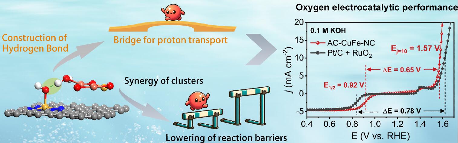 基于此,研究工作2報(bào)道了一種原子全暴露的Fe摻雜的CuO團(tuán)簇與單原子位點(diǎn)協(xié)同的新型催化劑。實(shí)驗(yàn)和DFT計(jì)算表明:一方面,協(xié)同的Cu-O-Fe 團(tuán)簇能有效誘導(dǎo)鐵單原子位點(diǎn)的電子結(jié)構(gòu)重新分布、調(diào)節(jié)氧吸附能并降低 ORR 勢(shì)壘;另一方面,譜學(xué)表征和理論計(jì)算表明Cu-O-Fe團(tuán)簇協(xié)同構(gòu)建了含氧反應(yīng)中間體與電解質(zhì)分子之間的氫鍵,所構(gòu)建的氫鍵不僅可以穩(wěn)定含氧反應(yīng)中間體,同時(shí)拉伸了ORR最后一步的Fe-O鍵長(zhǎng),有助于OH*的脫附;更為質(zhì)子傳輸提供了通道,提高了反應(yīng)動(dòng)力學(xué)。這項(xiàng)研究中展示的新穎的催化劑結(jié)構(gòu)和協(xié)同機(jī)制,為開發(fā)綠色能源轉(zhuǎn)換裝置中的高性能催化劑提供了新的視角和參考。