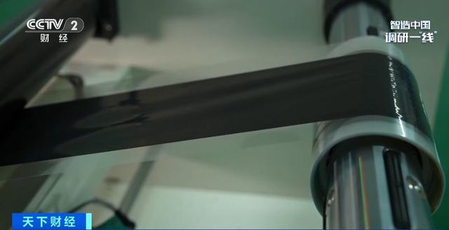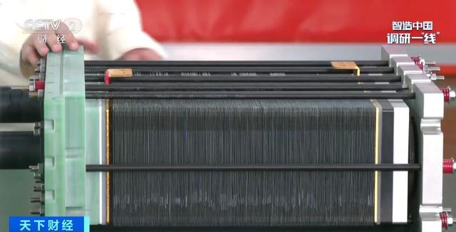 一條產(chǎn)線正在進(jìn)行膜電極的生產(chǎn),制作過(guò)程就是將催化劑均勻涂在質(zhì)子交換膜的兩側(cè)。這條產(chǎn)線的催化劑只有3微米厚,相當(dāng)于正常頭發(fā)絲的二十分之一。它可以使生產(chǎn)的膜電極更薄、重量更輕,從而降低整個(gè)電堆的厚度,提高功率。目前,這條產(chǎn)線可以實(shí)現(xiàn)每天生產(chǎn)1萬(wàn)片膜電極。