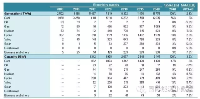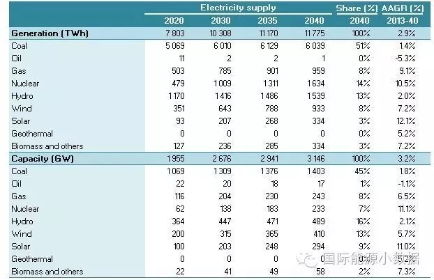 2040 年一次能源供應(yīng)達(dá)到46.95億噸標(biāo)油,其中煤炭占51%、石油16%、天然氣13%、核電5%、水電3%、非水可再生能源12%。從發(fā)電量來看,2040年總裝機(jī)達(dá)3145吉瓦,發(fā)電量達(dá)11.78萬億千瓦時(shí),煤電占56%、天然氣發(fā)電9%、核電8%、水電13%、風(fēng)電8%、光伏3%、生物質(zhì) 3%。