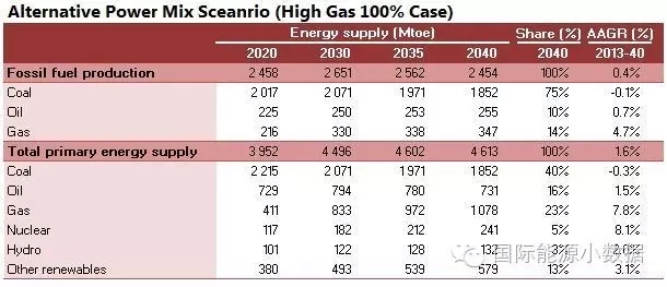 在大力推廣天然氣發(fā)電的情境下,2040年一次能源供應(yīng)為46.13億噸標(biāo)油,其中煤炭跌至40%、石油16%、天然氣高達(dá)23%、核電5%、水電3%、非水可再生能源13%。從發(fā)電量來看,2040年總裝機(jī)達(dá)3146吉瓦,發(fā)電量達(dá)11.78萬億千瓦時(shí),煤電占36%、天然氣發(fā)電30%、核電8%、水電 13%、風(fēng)電8%、光伏3%、生物質(zhì)3%。