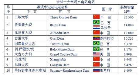 常規(guī)水電站是利用天然河流、湖泊等水能的發(fā)電站。目前世界上最大的水力發(fā)電站是在中國(guó)的三峽發(fā)電站(Three Gorges Dam),裝機(jī)容量達(dá)22500MW。